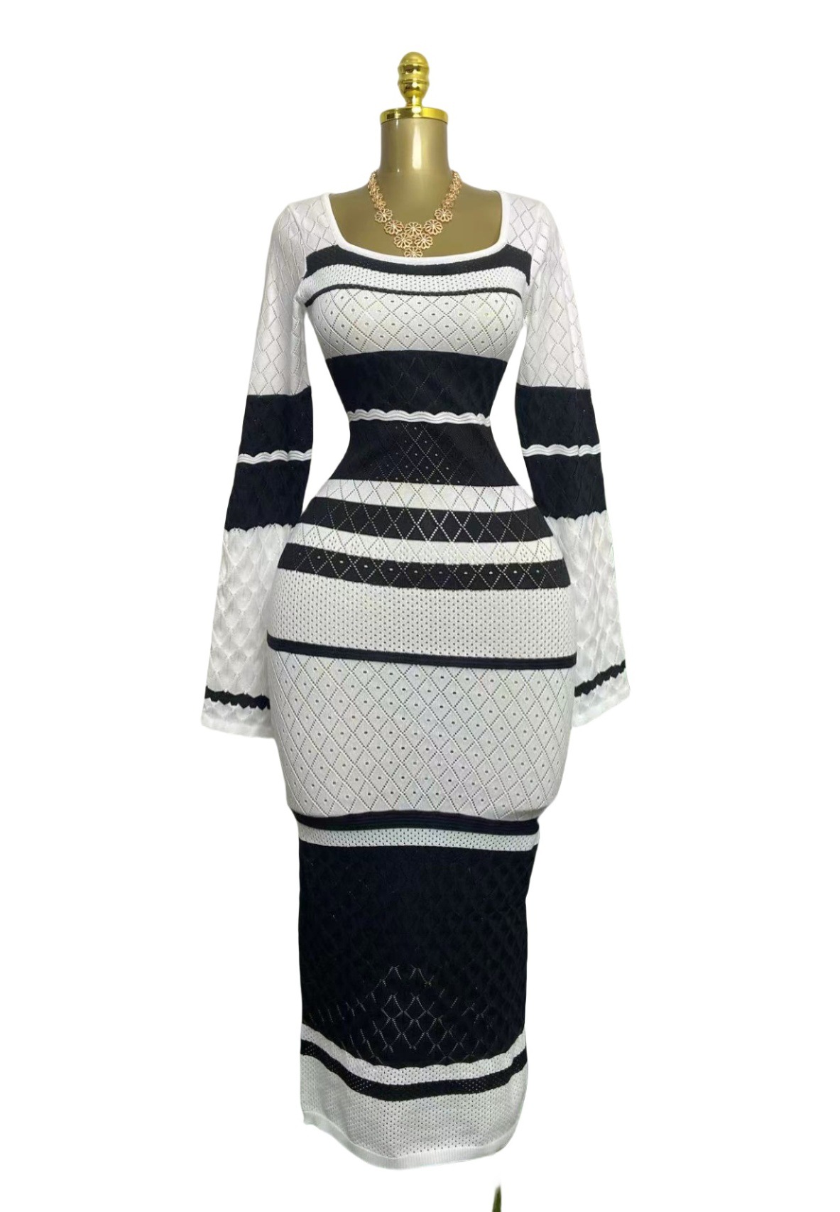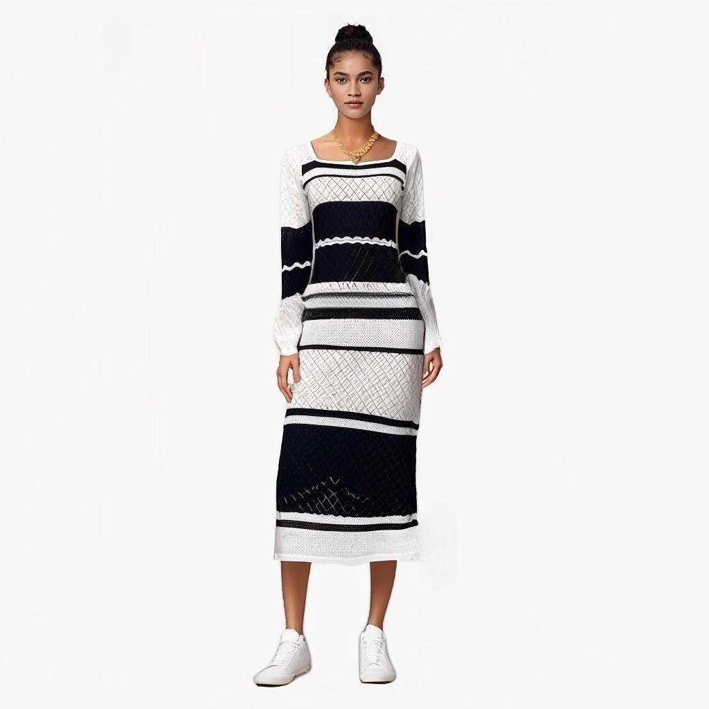 Colorful Contrast Color U-neck Sexy Long-sleeved Knitted Dress