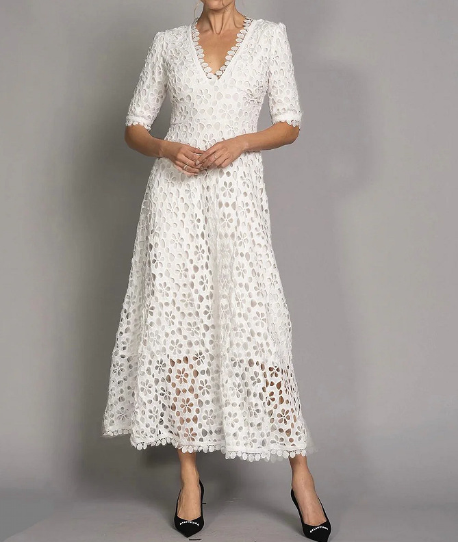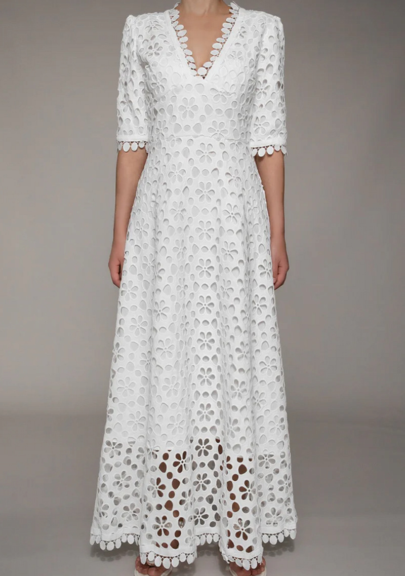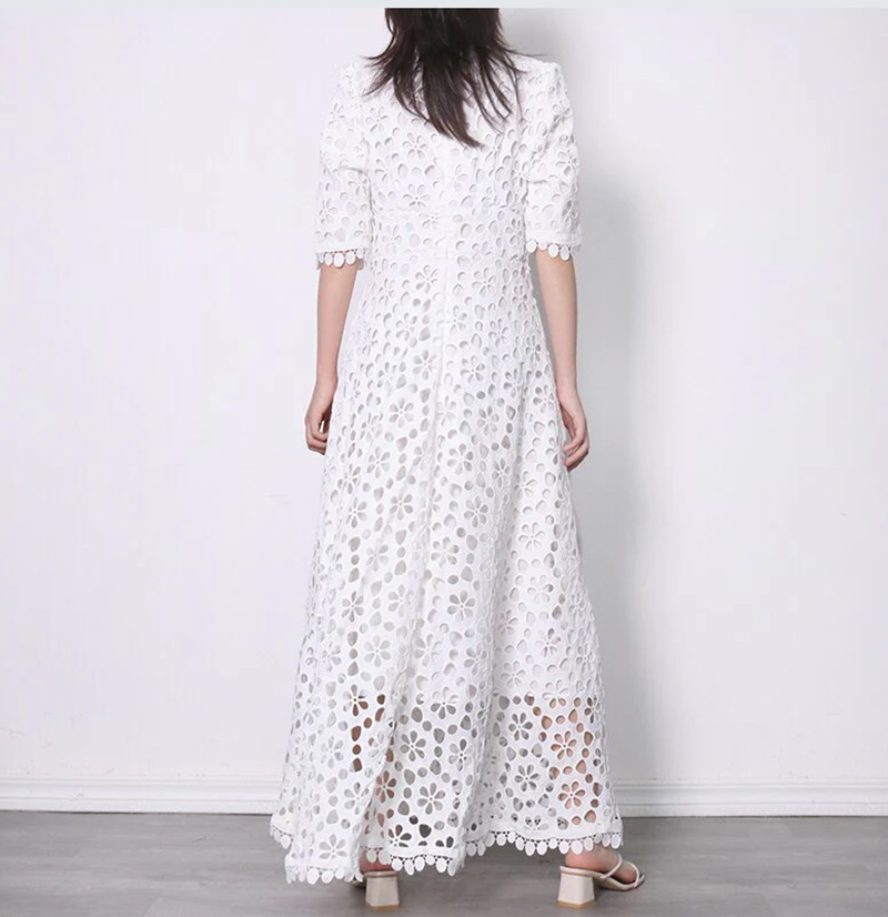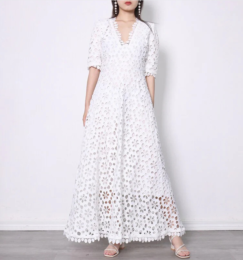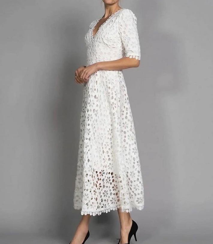 New Temperament Commuter White Lace Long Dress Elegant V-neck Design Floral Dress Evening Dress