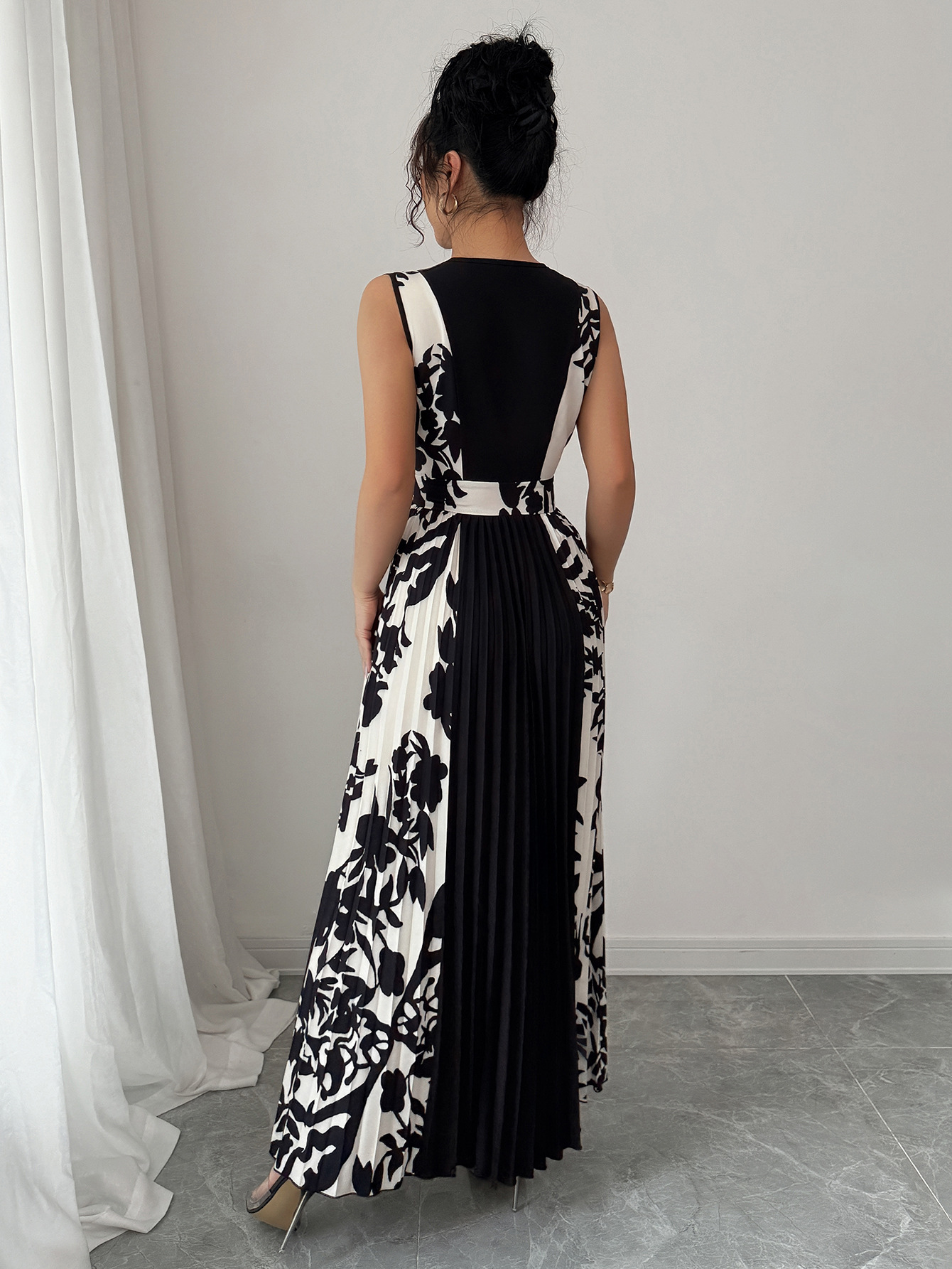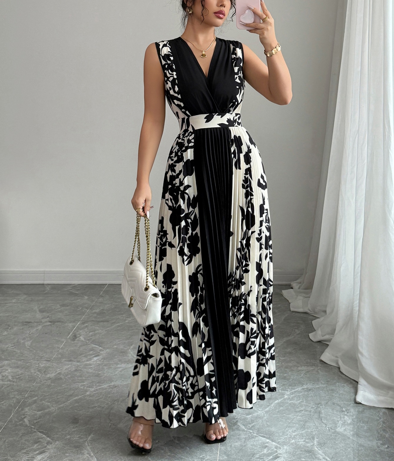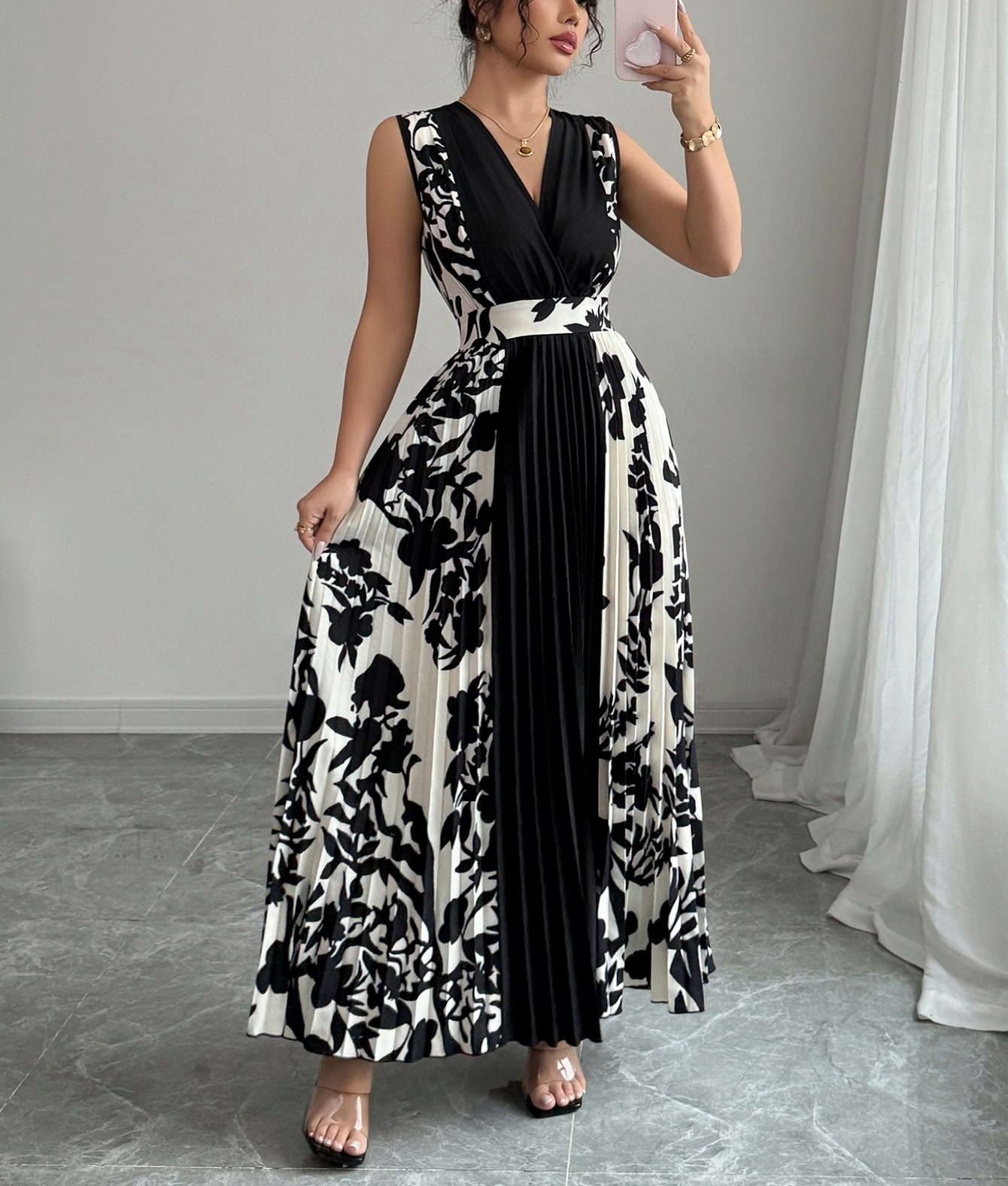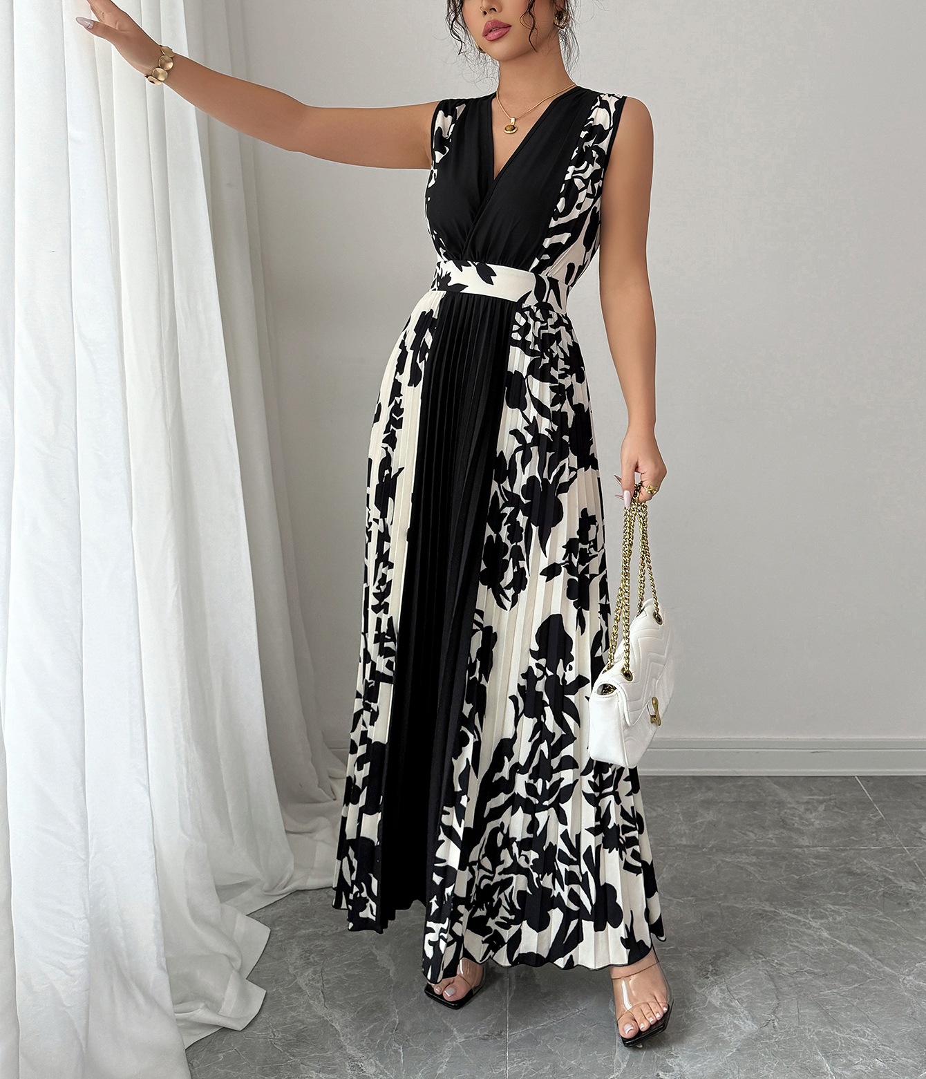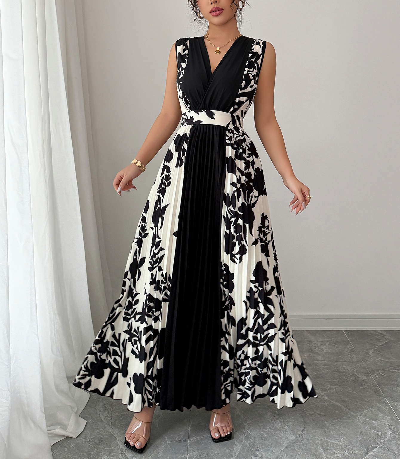 Sleeveless Printed Temperament V-neck Color-block Midi Dress